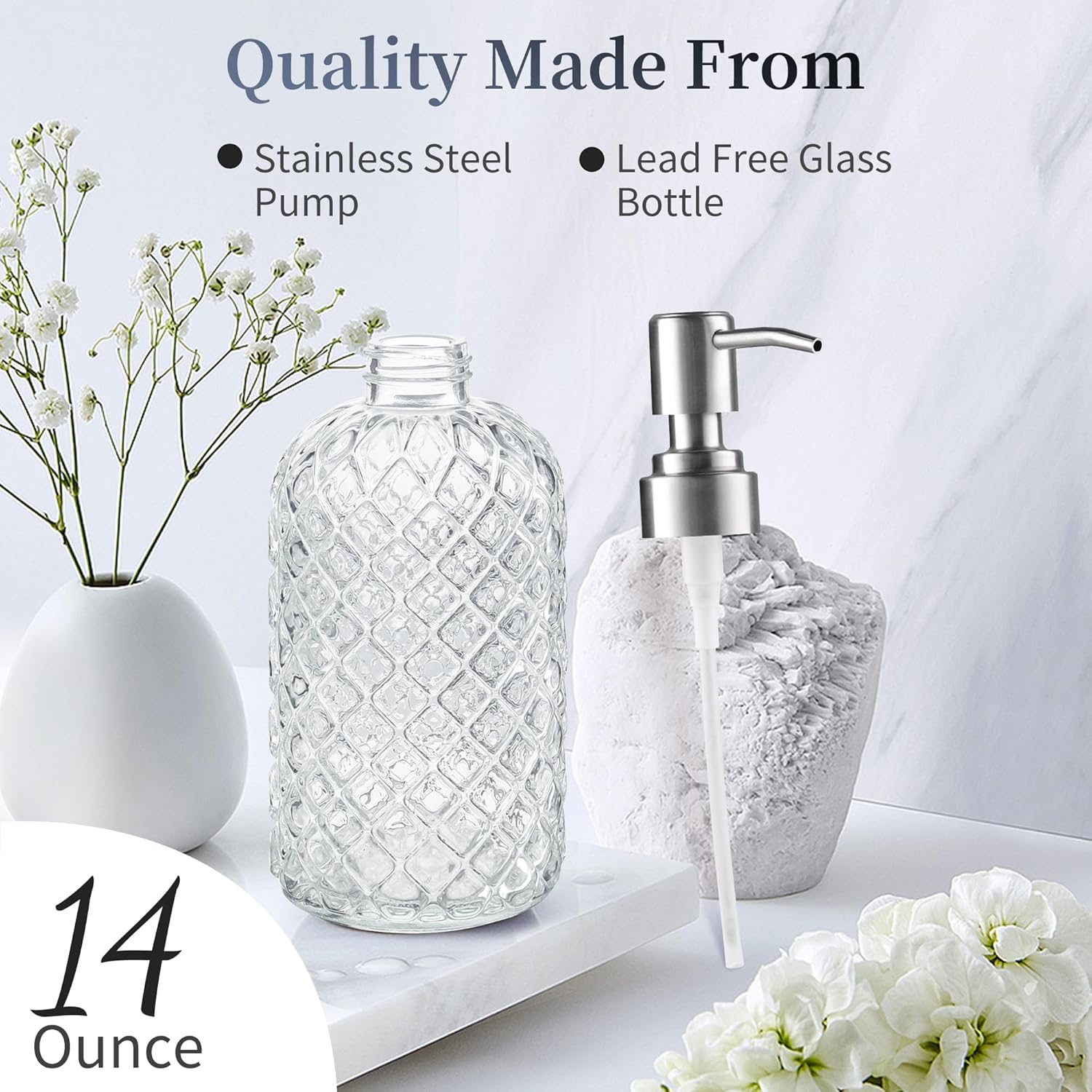 This 14oz glass soap dispenser is both beautiful and practical. The glass feels sturdy and high quality, and the pump works smoothly without clogging or dripping. It holds plenty of soap, so I’m not constantly refilling, and it looks great on my kitchen counter and bathroom sink. A simple upgrade that adds a touch of style while being eco-friendly and reusable.