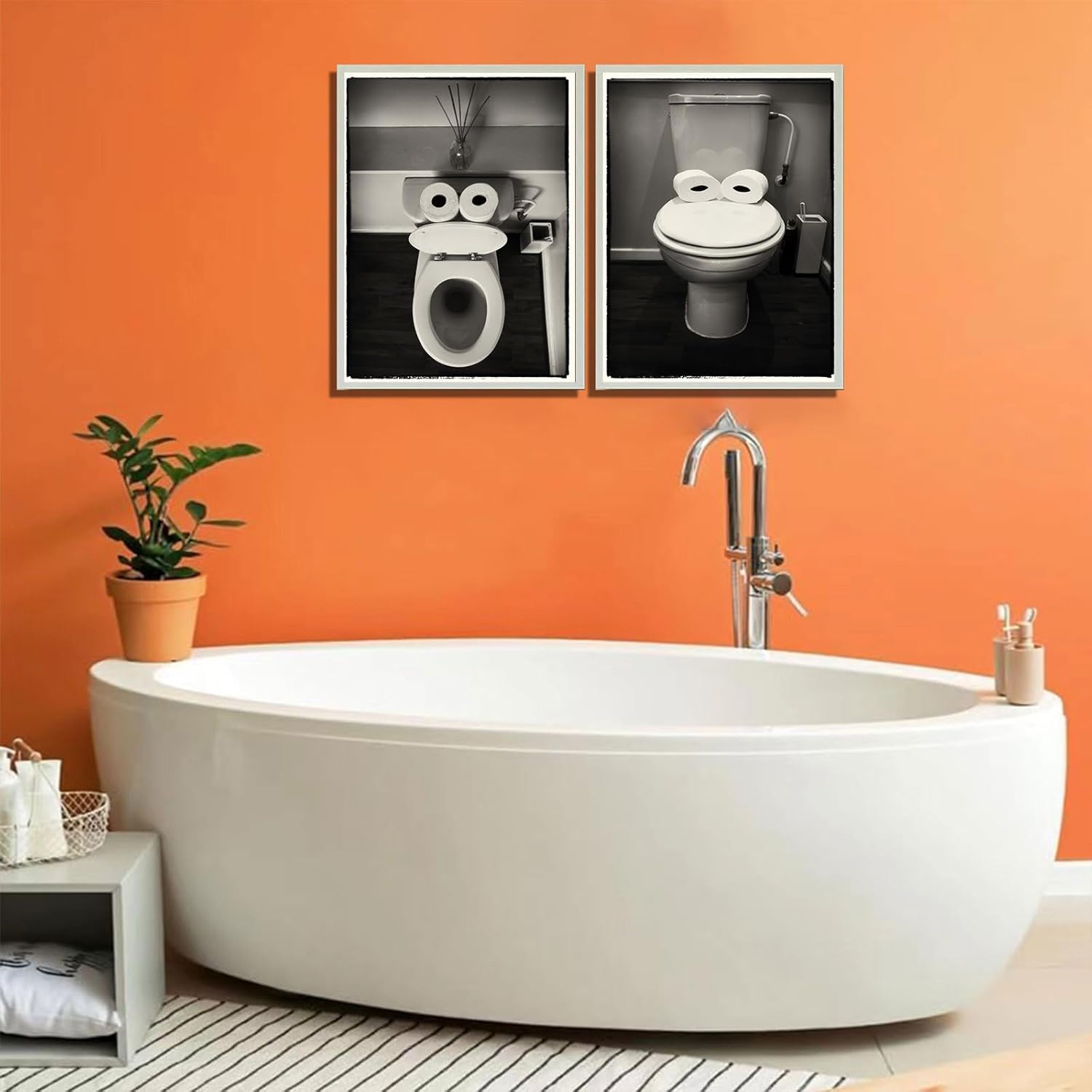 Funny Bathroom Art black and white bathroom wall art matching pair of photos that are sure to be a talking point! These 2 funny prints of toilets made into faces are sure to raise a smile in home or office!Funny guest bathroom decor is crafted using only the finest high-end canvas, ensuring durability and a premium finish
